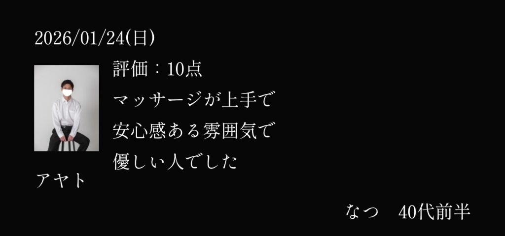 🖤頼れる大人の男、ここに登場🖤 はじめまして!アヤトです🍷✨ 彼は大人の魅力たっぷりのキャストとして、多くのお客様から信頼される存在です💼 その落ち着いた雰囲気とスマートな振る舞いは、まさに「安心感」の一言。 「話を聞いてほしい」「日々の疲れを癒したい」と感じている方にはピッタリ🌟 アヤトはあなたの気持ちをしっかりと受け止め、心に寄り添ったひとときを提供します💖 さらに、彼のちょっとしたユーモアと優しい笑顔が、日常のストレスを和らげてくれるはず😊🌈 気遣いのプロフェッショナルと過ごす時間は、きっとあなたの心に深く刻まれるでしょう✨ 📅 ご予約はお早めにどうぞ!アヤトがあなたをお待ちしております🌸